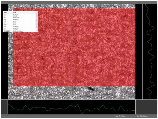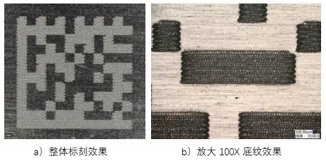 标刻二维码首先需要保证二维码的整体轮廓清晰,通过调整开光延时和关光延时可以实现。由于欧陆娱乐标刻二维码是由若干单脉冲光斑重叠形成的,振镜扫描速度和欧陆娱乐重复频率共同决定了光斑的重叠率。只有在合适的参数组合下达到一定的光斑重叠率才能标刻出有一定灰度或色彩的二维码,所以在进行二维码标刻试验之前,首先要找到合适的扫描速度、重复频率、填充线间距等参数。表3为标刻尺寸8mm*8mm二维码的推荐工艺参数,测试结果见图4和图5,可以看出脉冲点可整体均匀覆盖标刻区域,粗糙度测试仪结果显示底纹粗糙度在1μm左右。表3 20/30/50Qmini欧陆娱乐器标刻二维码推荐参数