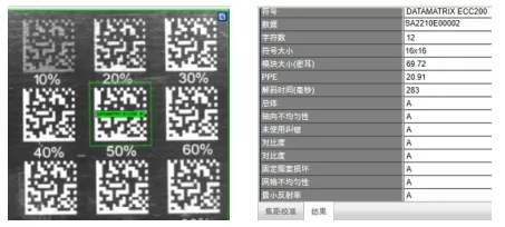 使用读码软件对二维码等级进行评定(图6),结果为A级,满足正常的应用需求。检测条件对读码评定及其重要,环形照明形式效果优于直条状照明,同时对于白色二维码选择白色光源效果较好,且光源的亮度需达到一定的值,才能使二维码形成高对比度。
