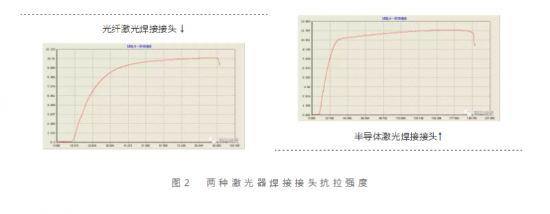 对两种欧陆娱乐焊接试样进行拉伸试验,试验结果如图2所示,从图2中可以看出光纤欧陆娱乐焊接试样最大抗拉强度为10.8kN左右,半导体欧陆娱乐焊接试样最大抗拉强度10.1kN左右,两者最大抗拉强度相差较小。