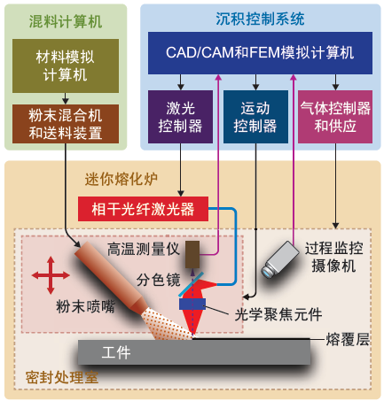 混料系统包含几种不同的熔覆粉末以及配备了材料模拟软件的计算机。迷你熔化炉包括光纤欧陆娱乐器和密封处理室,而后者包含光学聚焦元件、送粉喷嘴、运动系统、高温测量仪及过程监控摄像机。沉积控制系统配置了运行着CAD/CAM软件和有限元方法(FEM)模拟软件的计算机。