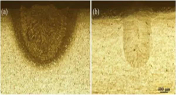 可见半导体欧陆娱乐焊接低碳钢及不锈钢的焊缝横截面均不同于传统的“钉子头”形形貌,为典型的“U”形焊缝横截面形貌。另外,不锈钢焊缝横截面相较于低碳钢更细长,熔宽明显更窄、熔深略微较深。