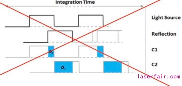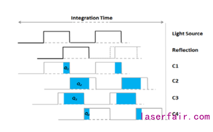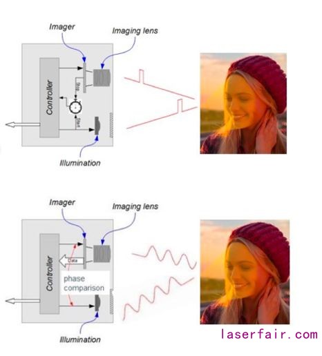 Itof和Dof在sensor和算法上的也有不小的区别. Itof目前更多是使用global shutter sensor 或者是在这个基础上改进的专用sensor.以原始的global shutter sensor 为例,最终的算法是使用基于正弦波的相位计算, 一般需要使用四帧图像才能通过相位得到距离,而这导致了sensor不得不工作在4倍于3D成像的帧率,比如3D成像需要30fps,sensor就不得不工作在120fps.这导致了系统功耗的增加和帧率提升的困难.