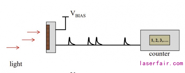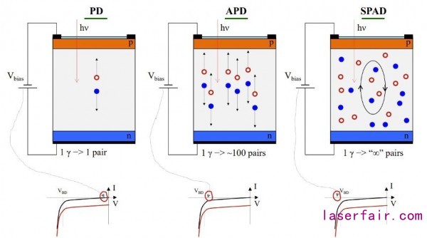 下图左起第一个是一般成像使用的PD(光电二极管),第二是APD(雪崩二极管),第三个是SPAD(单光子雪崩二极管),其主要差别APD和SPAD在通过增加偏置电压,在光子到光电二极管的时候会产生雪崩效应,就是产生大量的电子.这对成像不利,但是对于检测脉冲则很好.而SPAD比PAD更敏感,也就是只需要很少的光子就能产生雪崩效应.