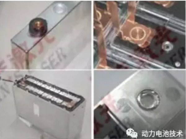 方形电池组合焊接时,极柱或连接片受污染厚,焊接连接片时,污染物分解,易形成焊接炸点,造成孔洞;极柱较薄、下有塑料或陶瓷结构件的电池,容易焊穿。极柱较小时,也容易焊偏至塑料烧损,形成爆点。不要使用多层连接片,层之间有孔隙,不易焊牢。
