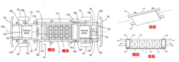 从公布的专利看,Canoo的方案主要是将模组布置在底盘中间,由纵横梁构建的隔间内,前后四个模组沿轴向、中间四个模组沿横向: