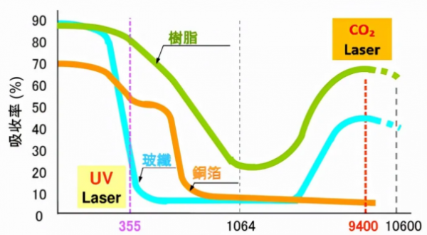 如图2所示,PCB板中常用的基材有铜箔、树脂和玻纤对不同波长的吸收率有很大的差异:铜箔对UV的吸收率很高,对CO2的吸收率很低;树脂和玻纤对不同波长的吸收率差异很大,树脂对UV和CO2的吸收率都很高,玻纤对CO2欧陆娱乐的吸收率较高。