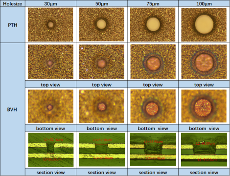 (3)、加工的导通孔,由于孔壁粗糙度(≤0.1μm)很低,在高频化信号传输中可明显减少信号传输损失和失真,特别是在叠孔结构的封基板装中有着极好的信号传输性能。