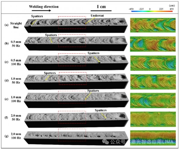 为阐明扫描路径对熔池行为的影响,采用高速摄像系统对熔池和锁孔的演变过程进行了观察。下图图(a)示出了直线路径下熔池的演化过程。图(b-f)为不同振荡参数下熔池的演化图。随着振荡频率和振幅的增加,熔池后部由于熔池宽度的扩大而变得更加圆润。随着熔池长度的增加,锁孔喷发引起的表面波动在后向传播过程中减小。因此,熔化的液态金属在熔池后端平滑而有规律地凝固,形成均匀致密的焊缝鱼鳞。