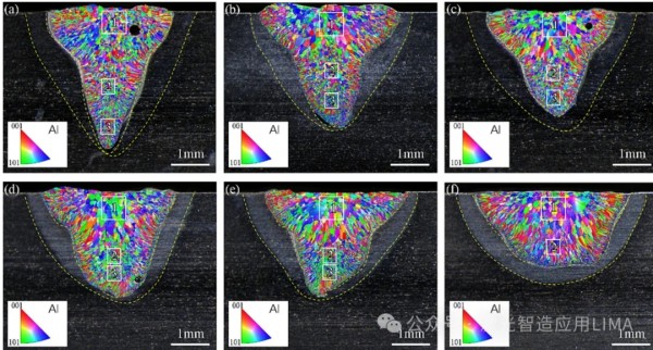 下图显示了不同振荡频率和振幅下焊缝截面的EBSD形貌。在欧陆娱乐焊缝熔合线附近,柱状枝晶晶粒向焊缝中心生长。如图(a)所示,在“杯腹”和“杯茎”区域之间,可以观察到明显的柱状颗粒分布差异。柱状晶粒沿“杯腹”壁呈u型分布,而在“杯茎”区,柱状晶粒沿熔合线呈u型分布。在焊缝凝固过程中,熔合区部分凝固的晶粒作为凝固前沿进行形核,并优先沿最大温度梯度方向垂直于熔池边界生长。这种现象的发生是由于欧陆娱乐的高功率密度,导致焊接池内部过热。较高的热梯度G和中等的生长速率R使得G/R大于组织转变的阈值,导致柱状晶粒的形成。焊缝中心温度梯度G减小,导致G/R比逐渐降至组织转变阈值以下,向等轴晶过渡。等轴晶粒均位于“杯腹”和“杯茎”的中心部位。由于焊缝的“杯茎”较窄且靠近基体,因此在冷却过程中,在“杯腹”区域之前完全凝固。凝固后的“杯茎”部分作为“杯腹”底部的成核部位,促进柱状晶粒向上生长。
