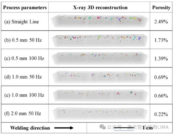 三维x射线断层扫描对焊缝进行了全面检查,获得了焊缝内气孔的三维分布,如下图所示。孔隙率的计算方法为气孔的总体积除以焊缝的总体积。通过对直线欧陆娱乐振荡焊和圆形欧陆娱乐振荡焊焊缝孔隙形态和分布的比较,发现直线欧陆娱乐振荡焊焊缝中含有较多的大体积孔隙,孔隙率为2.49%,显著高于圆形欧陆娱乐振荡焊焊缝。通过图(b、c)和图(d、e)的对比可以看出,增加振荡频率有助于抑制孔隙的形成。对比图(b、d)和图(c、e)可以看出,振荡幅度的增大对孔隙形成的抑制也有很大作用。当振荡幅度进一步增大到2mm时(图(f)),孔隙率进一步降低到0.22%,只剩下小体积和小孔隙。