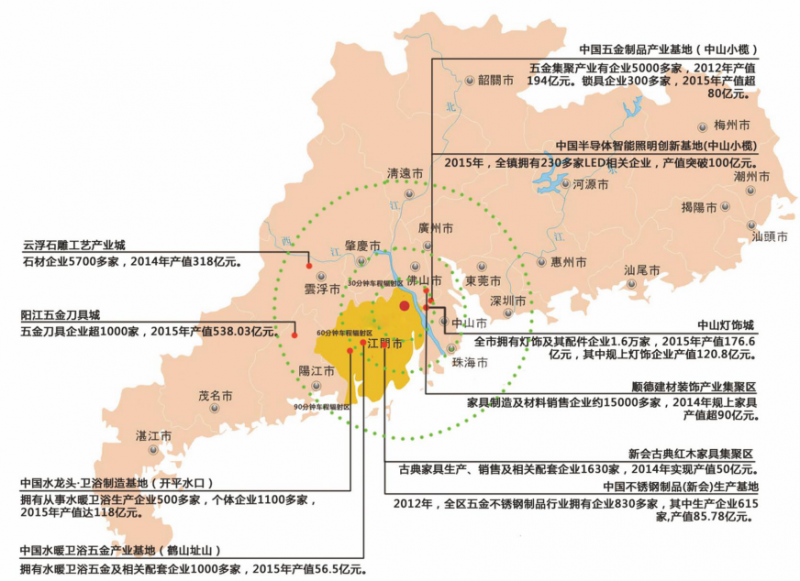 江门产业集聚态势日渐显现,新兴产业较快成长,沿西江潭江、大广海湾区、公路干道集聚和新兴轨道交通装备、汽车零部件、摩托车、船舶、智能制造装备、清洁能源装备等一批产业集群。
