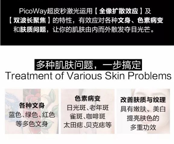 一站式解决各类肌肤问题,为广大求美者提供安全、高效、舒适的治疗感受。对于色素他有一套独有的波长在做到彻底祛除色素。