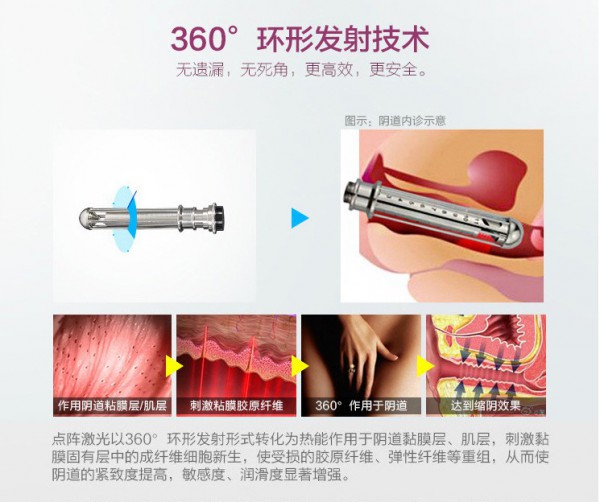 通过镀金的360反射手具,以环形的发光模式作用到阴道壁。以不接触阴道壁的方式,将能量均匀全面的作用到阴道全段,操作简便,作用时间短,安全性更高。