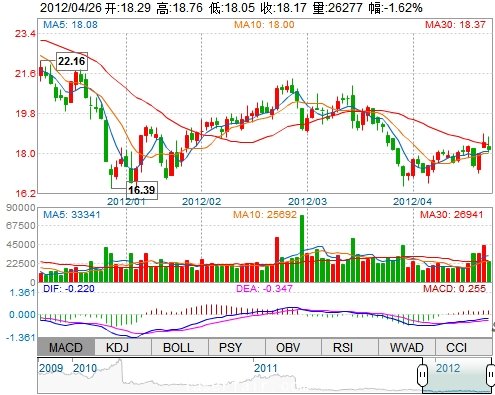 今 开: 18.29 成交量: 26277手 振 幅: 3.84% 最 高: 18.76 成交额: 4815.90万 换手率: 1.28% 最 低: 18.05 总市值: 54.08亿 市净率: 4.45 昨 收: 18.47 流通...