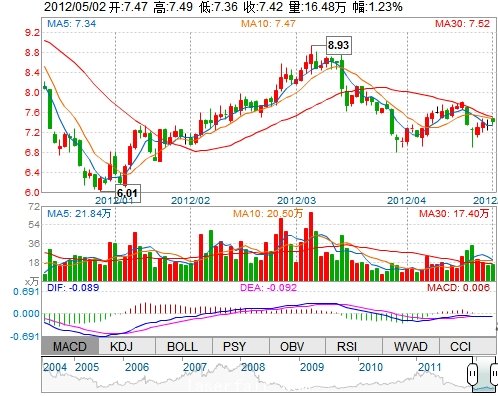 今 开: 7.47 成交量: 164768手 振 幅: 1.77% 最 高: 7.49 成交额: 12238.23万 换手率: 1.74% 最 低: 7.36 总市值: 77.49亿 市净率: 2.60 昨 收: 7.33 流通市...