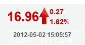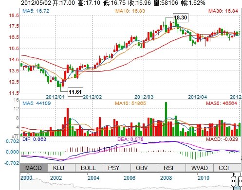 今 开: 17.00 成交量: 58106手 振 幅: 2.10% 最 高: 17.10 成交额: 9847.23万 换手率: 1.43% 最 低: 16.75 总市值: 75.57亿 市净率: 2.86 昨 收: 16.69 流通...