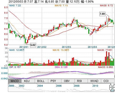 今 开: 7.07 成交量: 120950手 振 幅: 4.06% 最 高: 7.14 成交额: 8458.81万 换手率: 2.77% 最 低: 6.85 总市值: 30.58亿 市净率: 2.25 昨 收: 7.14 流通市值...