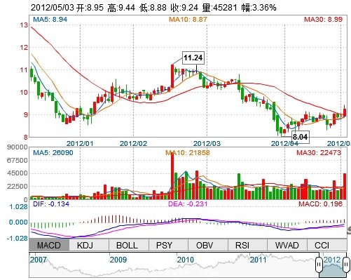 今 开: 8.95 成交量: 45281手 振 幅: 6.26%
