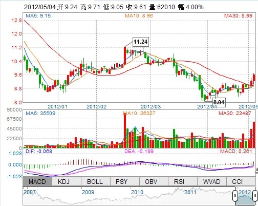 今 开: 9.24 成交量: 62010手 振 幅: 7.14% 最 高: 9.71 成交额: 5915.85万 换手率: 3.19% 最 低: 9.05 总市值: 19.15亿 市净率: 3.97 昨 收: 9.24 流通市值...