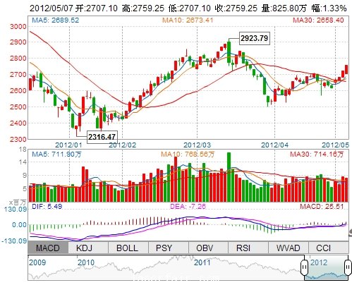 今 开: 2707.10 最 高: 2759.25 最 低: 2707.10 振 幅: 1.92% 昨 收: 2723.06 成交量: 8258024手 成交额: 1101541.23万 换手率: --