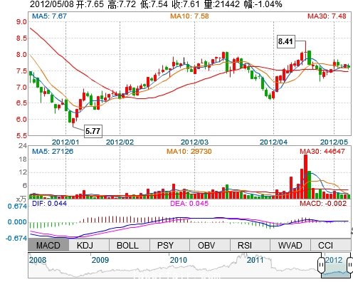 今 开: 7.65 成交量: 21441手 振 幅: 2.34%