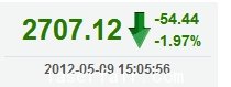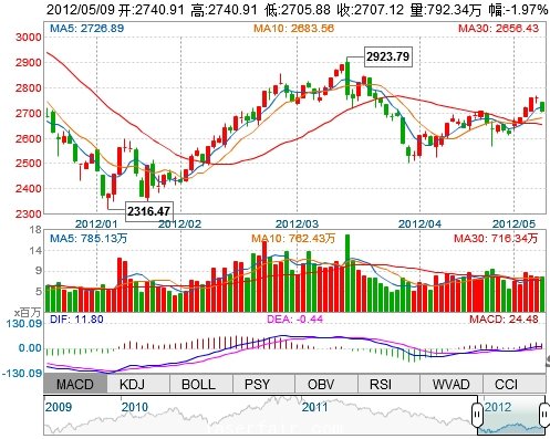 今 开: 2740.91 最 高: 2740.91 最 低: 2705.88 振 幅: 1.27% 昨 收: 2761.56 成交量: 7923354手 成交额: 1003532.75万 换手率: --