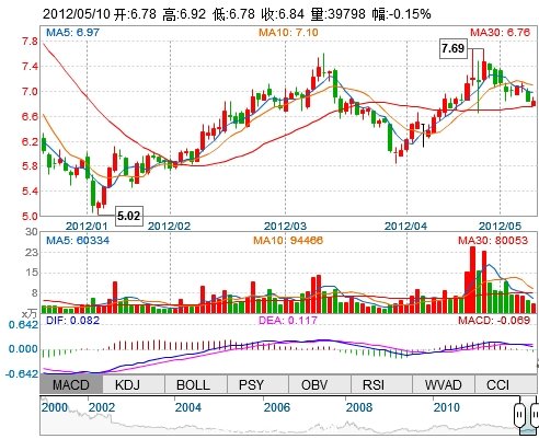 今 开: 6.78 成交量: 39797手 振 幅: 2.04% 最 高: 6.92 成交额: 2732.46万 换手率: 0.91% 最 低: 6.78 总市值: 29.88亿 市净率: 2.20 昨 收: 6.85 流通市值...