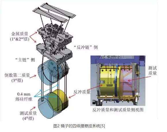 高新LIGO 探测器能够探测极微弱的引力波应变,必然对环境中的微小振动非常敏感。它本质上是一个巨大的地震仪,可以感应附近路上的车辆,远处海浪拍岸,还可感应地球上几乎所有重要的地震。这些机械振动是低频端的主要噪声来源。为降低震动噪声,每个镜子都被悬挂在一个复杂的四级摆系统上,如图2 所示;而这个四级摆系统又固定在一个主动震动隔离平台上。以此来滤除大部分机械波,隔离外界的干扰[5]。