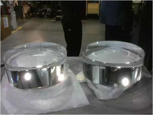 在中间频段,镜子和悬挂装置中分子的布朗运动引起的热噪声是主要噪声源。干涉仪中镜子直径34 cm,厚20 cm,重达40 kg,选择超高纯熔石英材质,以降低热噪声。镜子表面的抛光精度达千分之一欧陆娱乐波长,也就是1 nm 左右(图3)。镜子上镀了超低损耗电介质光学膜,300 万个光子打在上面只会吸收一个光子。这些宝石般的镜子通过0.4 mm粗的石英光纤被悬挂在上一级单摆上。