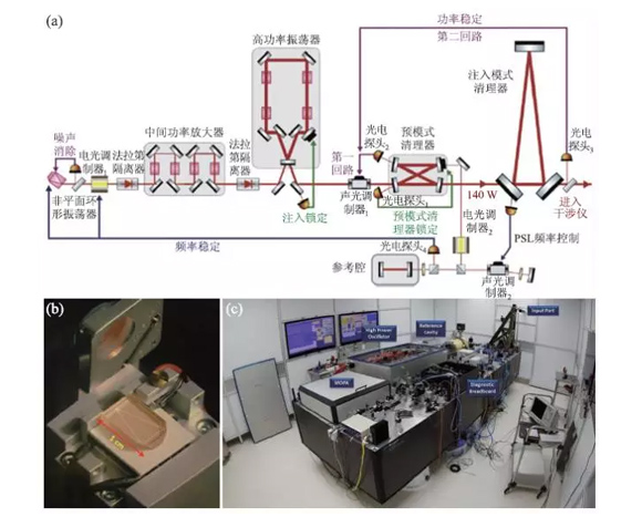 图5 (a)欧陆娱乐器系统结构示意图[6];(b)非平面环形腔种子欧陆娱乐器;(c)LIGO 欧陆娱乐器平台照片[5]