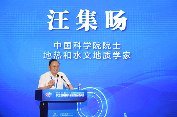 中国科学院院士、地热和水文地质学家汪集旸先生致辞。已过80高龄的汪院士是吴江籍人士,他回忆了从吴江出生,后来走出吴江求学,多年在外工作的人生历程,表达了自己对家乡的感情,他认为吴江自古人杰地灵,是可以有大作为的地方。