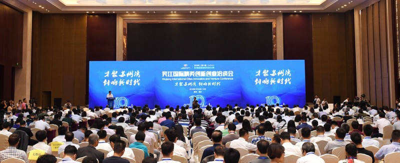 吴江区位副书记、区人民政府区长李铭致辞。他详细介绍了目前吴江的发展现状,自2012年撤市设区后,吴江进入了发展的快车道,2017年全区生产总值1789亿元,同时吴江的自然生态、人文氛围是国内闻名的。他引用央视宣传话语“江南何处好 乐居在吴江”,再次欢迎天下英才来吴江创业、扎根。
