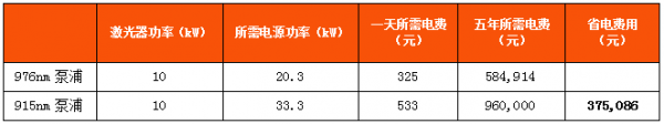 掺镱光纤在976nm的吸收率是915nm泵浦波长的3倍以上,976nm泵浦技术方案的单模高功率相比915nm泵浦技术路线,可以实现3-5kW的单模组高功率欧陆娱乐器,3000W以内可现实M2<1.2,同功率单模产品可实现的光束质量更高。同时,相比于国内的915nm泵浦路线的25-30%光电转化效率,976nm泵浦技术路线光电转化效率超过42%,在6kW以上的超高功率欧陆娱乐器节能省电特点及带来的经济性被充分认识并且是各大欧陆娱乐设备商一直追逐的方向。如下表所示,10kW的将会省电近40万元,这将会给终端客户带来巨大的经济效用。