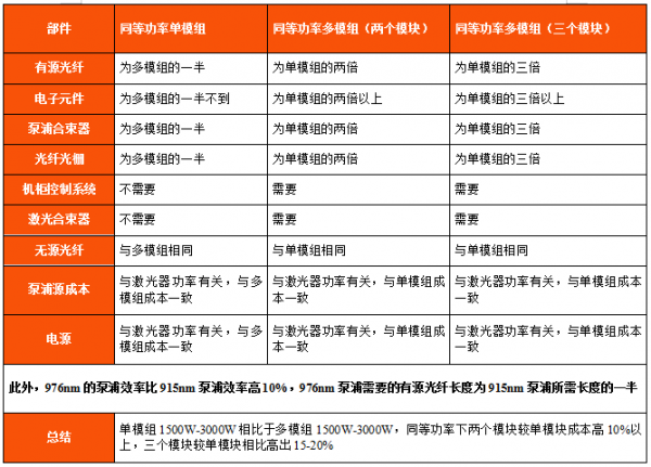 976nm单模块相比于同功率915多模块大大减少原材料使用。976nm泵浦技术路线可实现单模单腔3000W,元器件的成本降低较多,相比如多模块的元器件使用对比如下: