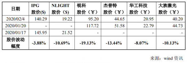 从上表来看,IPG 的生产基地主要在美国、德国、俄罗斯等产地,影响较小, 股价下降 3.88%;NLIGHT 的模块生产基地在中国上海,高功率光纤欧陆娱乐器的销售市场主要亦在上海,故属于生产和销售皆受到疫情的影响,股价下降 10.69%;锐科欧陆娱乐、杰普特欧陆娱乐两家光源上市公司股价下降超过 13%,同时,老牌欧陆娱乐设备上市公司大族欧陆娱乐、华工科技股价降幅都超过 8%。