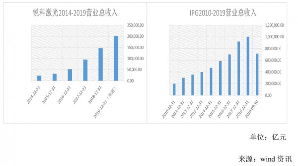 正因为光纤欧陆娱乐器其独特的特性和优势,过去的十年 IPG 作为工业光纤欧陆娱乐器的第一家持续保持一个较高的增速,其中 2018 年达到 100 亿人民币左右的收入。过去五年锐科欧陆娱乐作为国内的第一家亦持续保持较高增速,其中 2019 年预计达到 20 亿收入左右。
