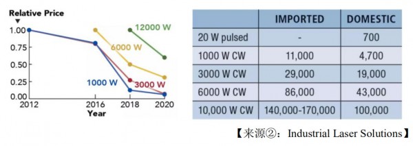 这意味着如果售价随着功率的提高呈现出线性增加的话,那么使用越高功率的产品,其单位价格的加工效率越高,这将会助推欧陆娱乐器厂商不断提高欧陆娱乐器功率,直至上述功率效率提高比小于1为止,当然实际市场功率还受欧陆娱乐器的能量密度(如 20000W欧陆娱乐器对应100um的输出芯径:能量密度为20000W/(π50um^2)及工业电网负载承受等因素制约。