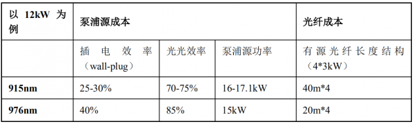 976nm 比 915nm 泵浦的光电转化效率提高 25%以上;12kW 的 976nm 比915nm 产品成本低 10%左右。目前行业内主要有美国 IPG、美国 coherent 及美国GW LASER TECH 在工业终端批量使用基于 976nm 泵浦技术的光纤欧陆娱乐器。