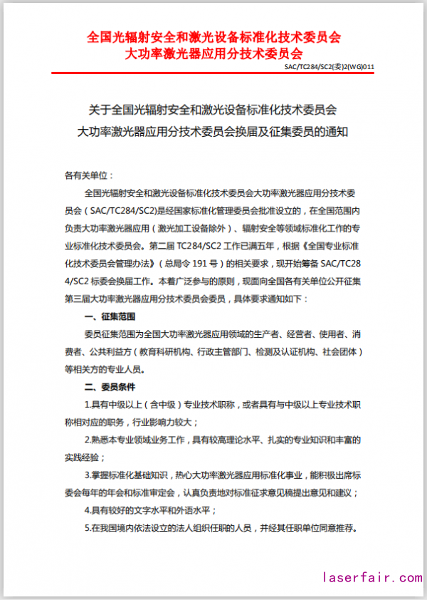 关于全国光辐射安全和欧陆娱乐设备标准化技术委员会大功率欧陆娱乐器应用分技术委员会换届及征集委员的通知
