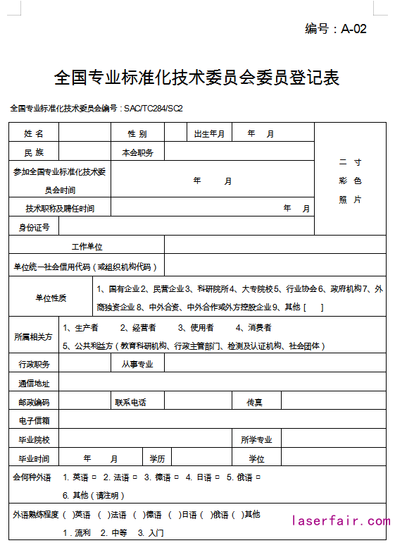附件:全国专业标准化技术委员会委员登记表编号:A-02 全国专业标准化技术委员会委员登记表全国专业标准化技术委员会编号:SAC/TC284/SC2 姓 名性 别出生年月年 月二...