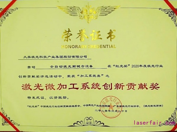 在本次评选中,大族显视与半导体的“明星产品”“全自动欧陆娱乐解键合设备”斩获红光奖2020年度欧陆娱乐行业“微加工系统创新贡献奖”。大族显视与半导体项目总监巫礼杰出席代表领奖。