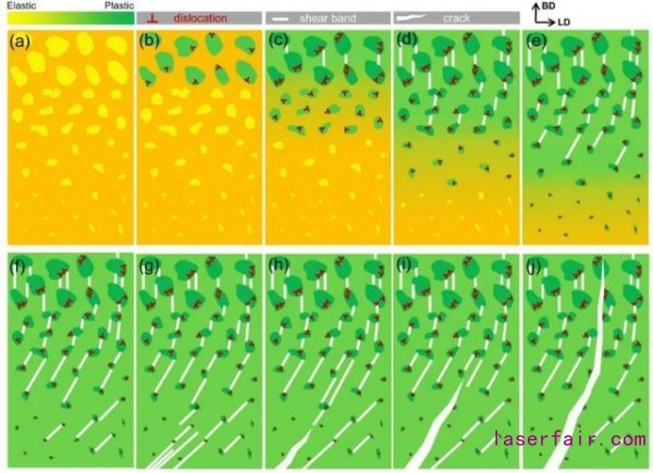 由于没有晶体缺陷,诸如位错,晶界等,块体金属玻璃(bulk metallic glasses (BMGs))呈现出高强度和弹性配以塑性加工性。块体金属玻璃的广泛大量的应用却受到了在室温下塑性差的限制,尤其是在拉紧应力的条件下。对于区域应力,塑性应变也高度的本地化为主要的剪切带,该剪切带快速的扩展和导致了块体金属玻璃的严重损坏。为了克服这一限制,二次相也经常通过原位的引入坚硬的块体金属玻璃基材中,并形成一种称之为块体金属玻璃基材复合材料。这些分散的软的枝晶促进多个剪切带的成核,阻碍了剪切带的快速发展进入到裂纹,并且相应地提高其韧性。