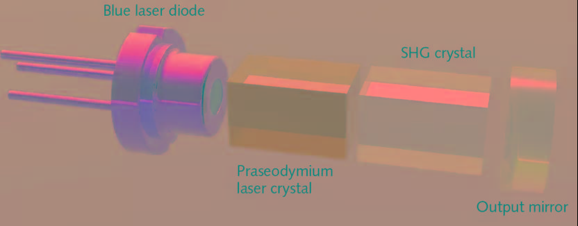 最近有公司开发一种商业化的基于blue diode的小型固体欧陆娱乐器。它由一个444nm的Blue diode+掺镨欧陆娱乐晶体+二倍频晶体+耦合腔镜构成,输出>10mW。