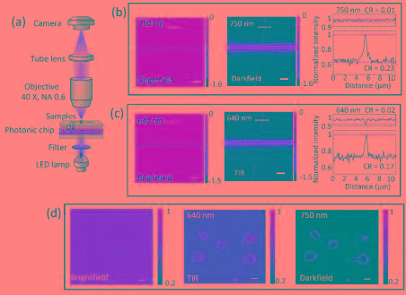 因此,在正入射下,经过该光学薄膜器件的光束出射角度要么是大于一定的角度(对应750 nm波长),要么是在薄膜表面产生光学表面波(对应640 nm 波长)。利用一块光学薄膜器件,在常规的明场显微镜上(图2a),可同时实现暗场显微成像与全内反射成像。成像效果如图2b,2c所示,相对于明场光学显微镜像,其成像对比度有大幅度的提升。该种方法不仅适用于空气中的样品,也适用于液体环境中生物活细胞的成像,如图2d所示。