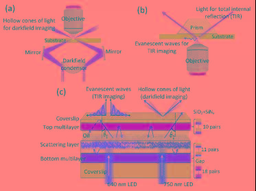 图1 传统暗场照明(a)与全内反射照明(b)光学显微镜,基于光学薄膜结构的显微成像照明元件