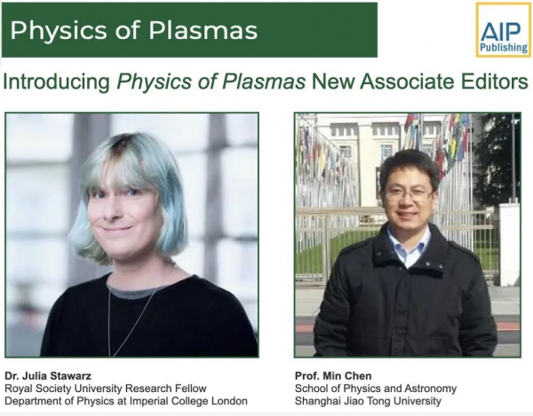 近日,上海交通大学物理与天文学院陈民教授与帝国理工学院Julia Stawarz研究员应Physics of Plasmas主编Michael E. Mauel邀请担任该刊的新任副主编。Physics of Plasmas由美国物理联合会 (AIP) 出版社与美国物理学会(APS)等离子体物理分会合作出版。该刊起源于1958年创刊的Physics of Fluids杂志,1994年正式定名为Physics of Plasmas,是等离子体物理领域国际著名的综合性期刊,致力于出版在理论、计算和实验等离子体物理领域的原始研究。