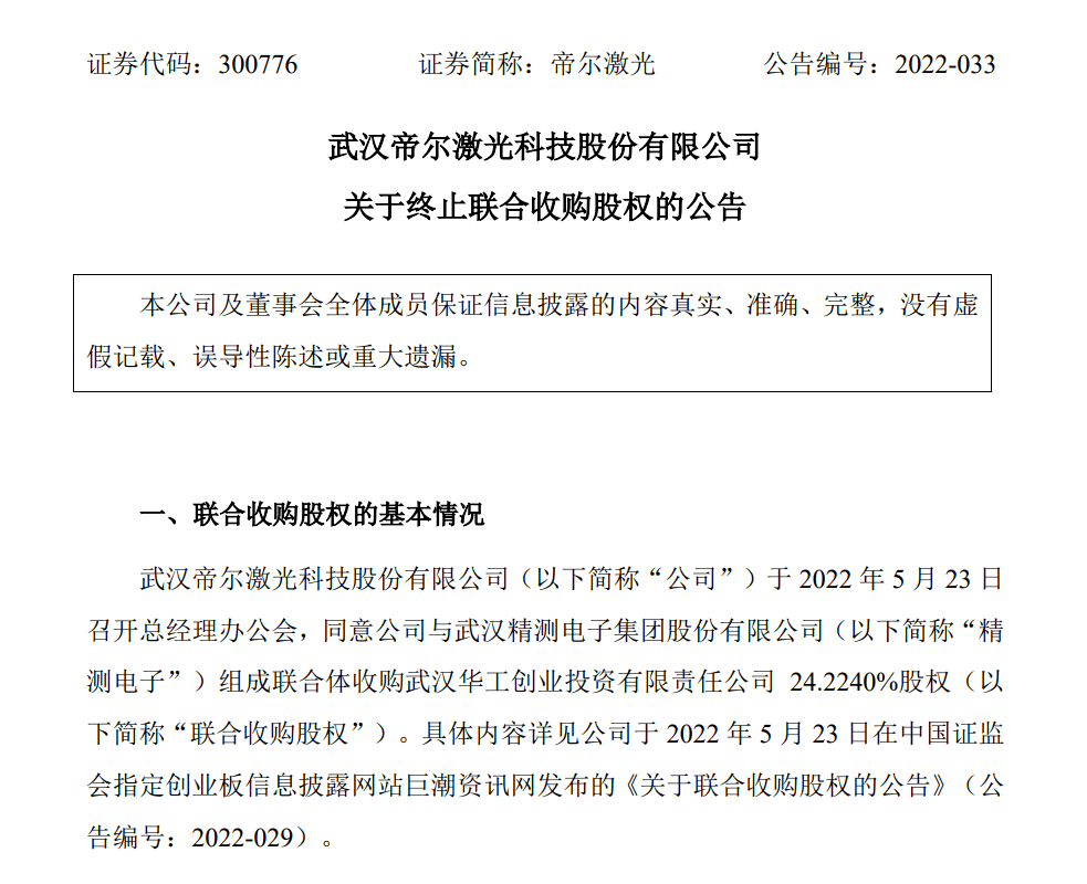为聚焦主业,综合考虑各方面因素,帝尔欧陆娱乐经审慎考虑,于2022年5月29日召开总经理办公会,决定终止本次联合收购股权事项,并于同日与精测电子签订了《解除<联合收购协议>之协议书》。