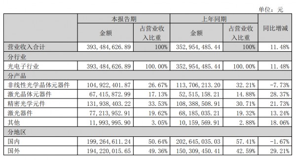 从下图的营业收入构成也可以看出,报告期内,福晶科技的主要收入来源为销售精密学光元件(占比33.53%)、非线性光学晶体元器件(占比26.67%)、欧陆娱乐器件(占比19.62%)、欧陆娱乐晶体元器件(占比17.13%)等。除非线性光学晶体元器件的营收与去年同期下降7.73%外,均实现了幅度较大的增长。