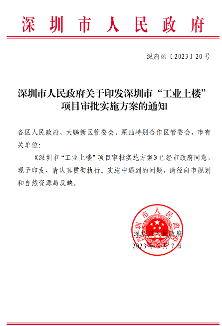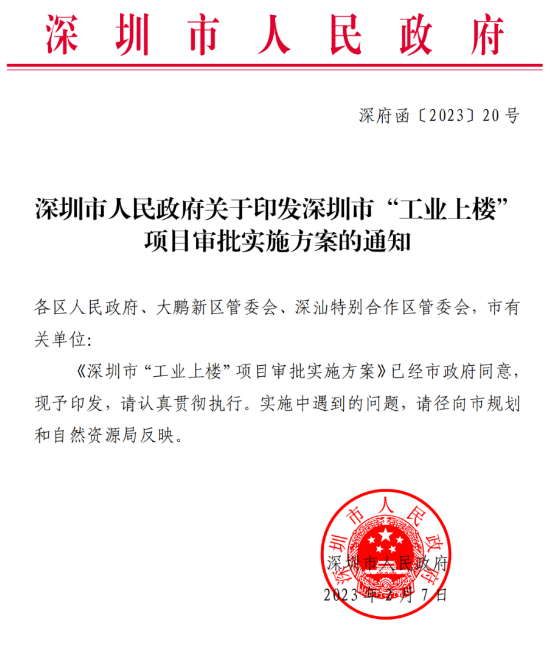 2023年2月7日,深圳市人民政府印发《深圳市人民政府关于印发深圳市“工业上楼” 项目审批实施方案的通知》。