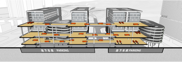 二是层高预留了未来生产的需求高度。考虑到先进制造业的生产需求,层高定为首层8m,2-9层6m,10-16层4.5m。三是楼层承重标准较高。该项目厂房的荷载标准为首层2.0吨,2、5、9层为1.5吨,10层及以上为0.8吨,其他层为1.0吨。这些负荷标准能满足绝大部分企业生产需求,荷载要求高的企业可入驻低楼层。四是采用了盘道和高架平台,装卸货可直通各楼层。借鉴裕廊“趋势工厂”经验,通过盘道连接各个楼层。每栋建筑由3个三层单元堆叠,2、5、9层架设高架平台,功能效果与首层相似。第9层平台有吊装重型设备的预留位置。同时2、5、9层预留有卸货平台及货车停车位。货车经盘道到达对应楼层平台卸货搬运,可大大缩减货运时间。